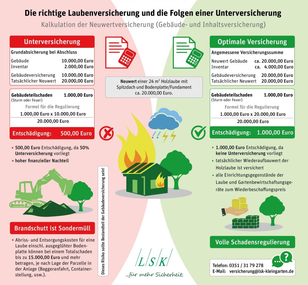 Jeder Gartenfreund sollte genau prüfen, wie hoch er die Gebäude- und Inhaltsversicherung abschließt. Im Schadensfall gibt es sonst Abzüge, wenn eine Unterversicherung besteht siehe Infografik.